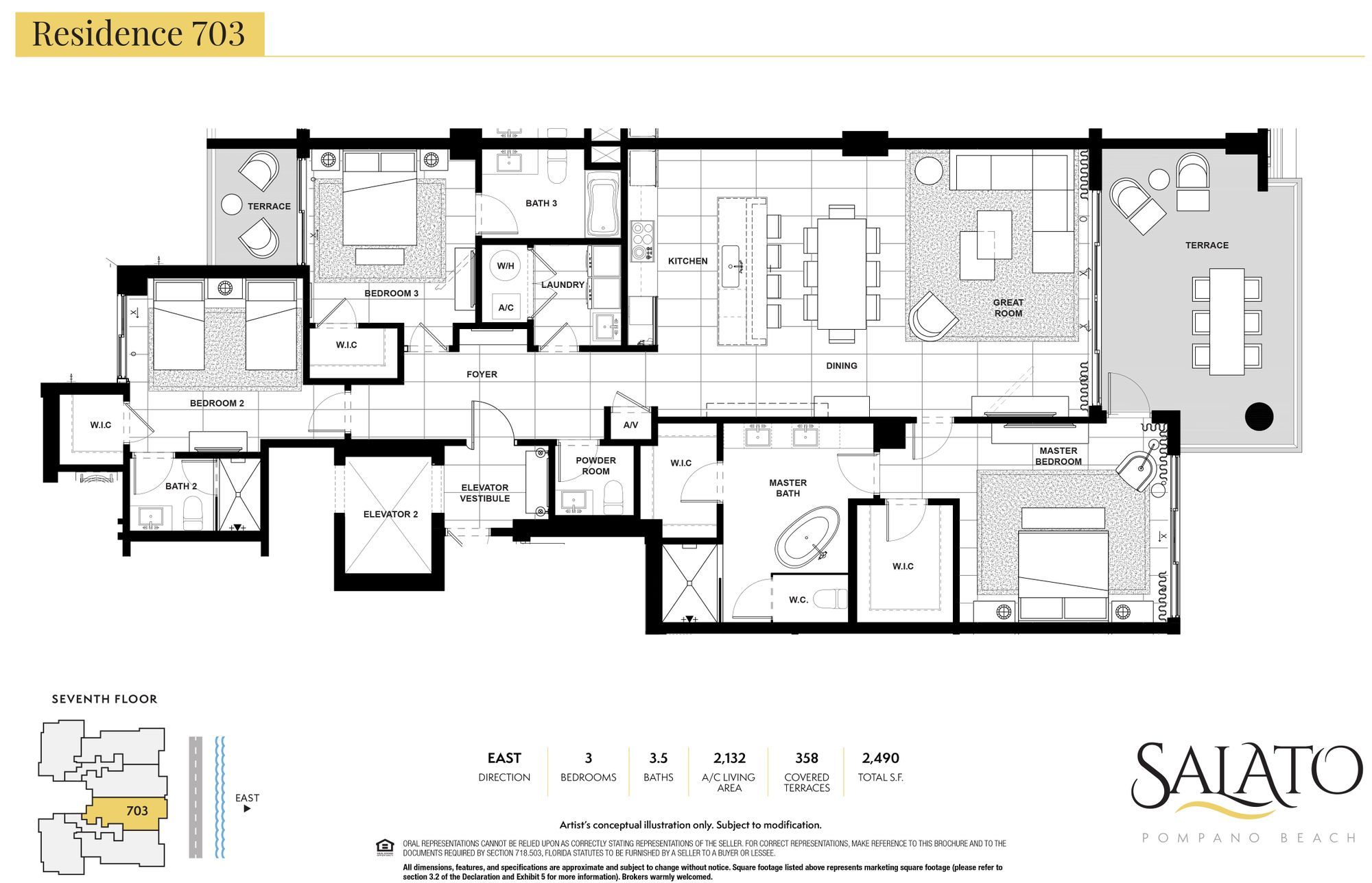 Ultra-luxe three-bedroom, three-and-a-half-bathroom ocean view residences Abundant natural light from 10’ windows and sliding glass doors in main living areas Incredibly rare 14-foot-deep terraces that range from 320 square feet to 746 square feet and provide exceptional outdoor living and entertainment Large open plan living concept, featuring great room, kitchen and dining area Kitchens to include premium selections of European cabinetry, featuring Subzero® and Wolf® appliances An array of Italian porcelain tile in all main living areas and bedrooms Solid core doors throughout the residences